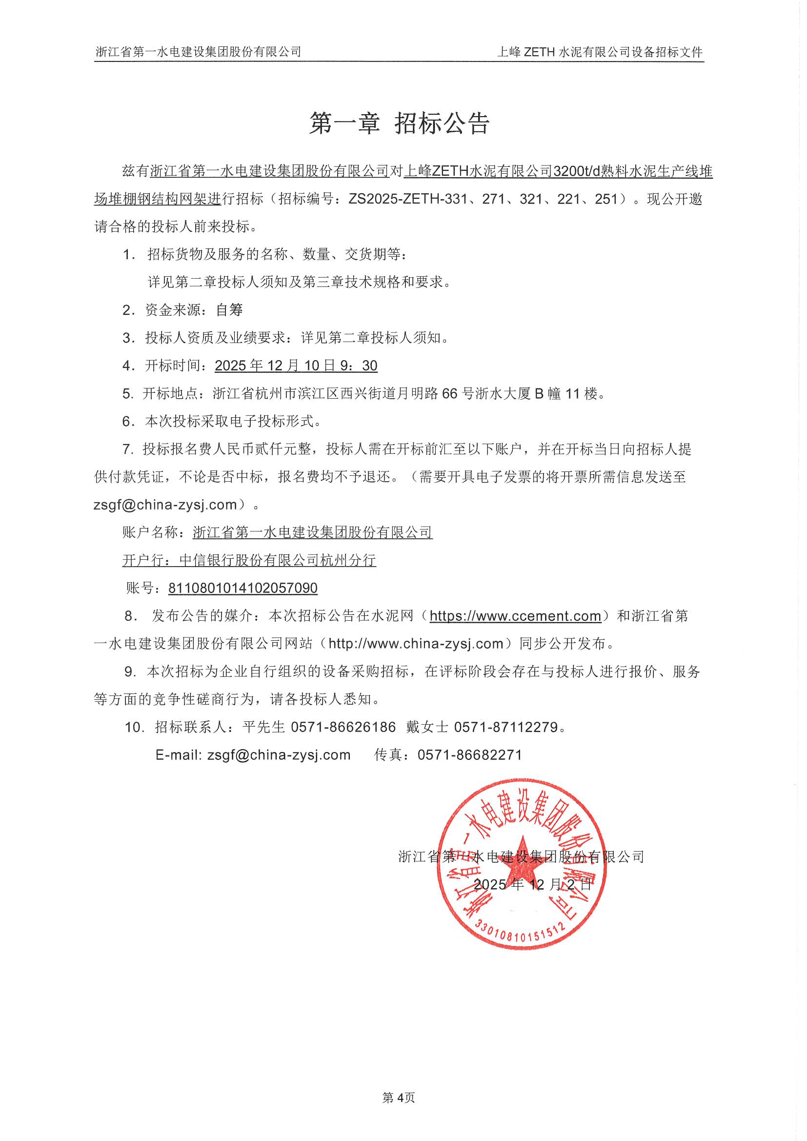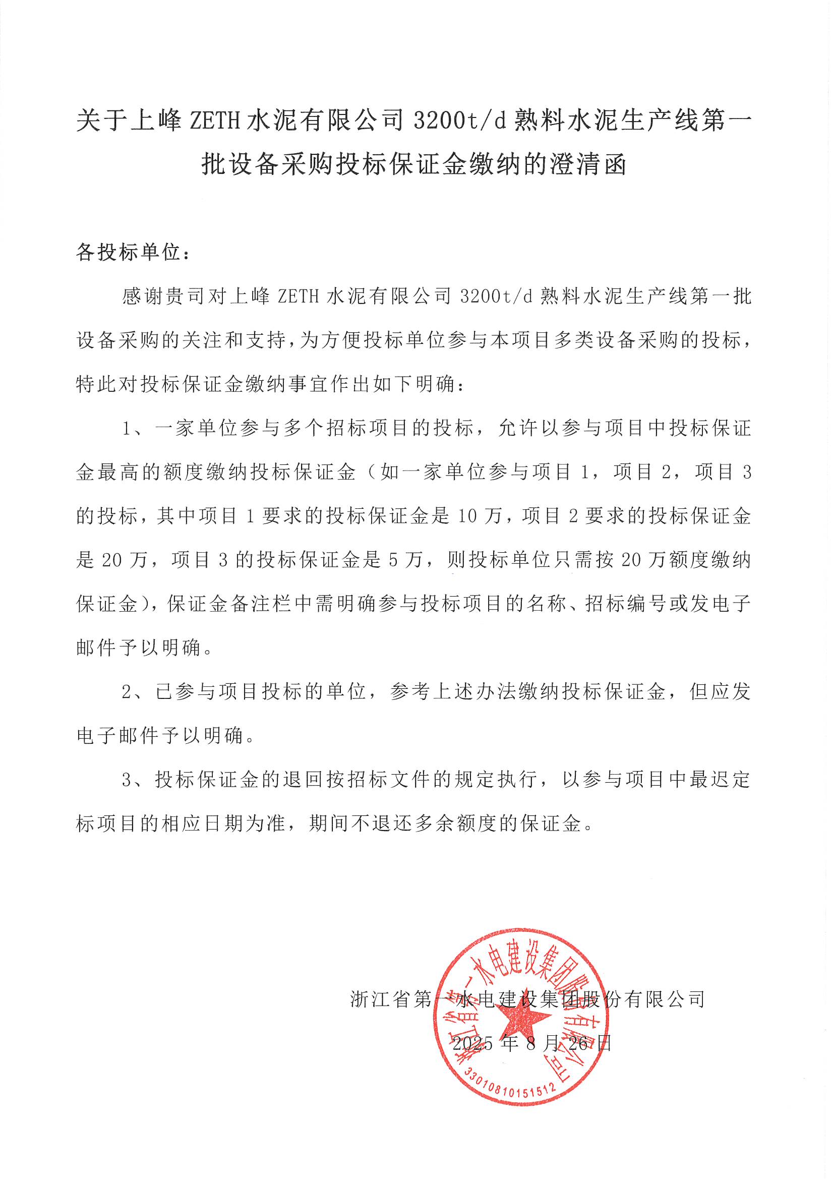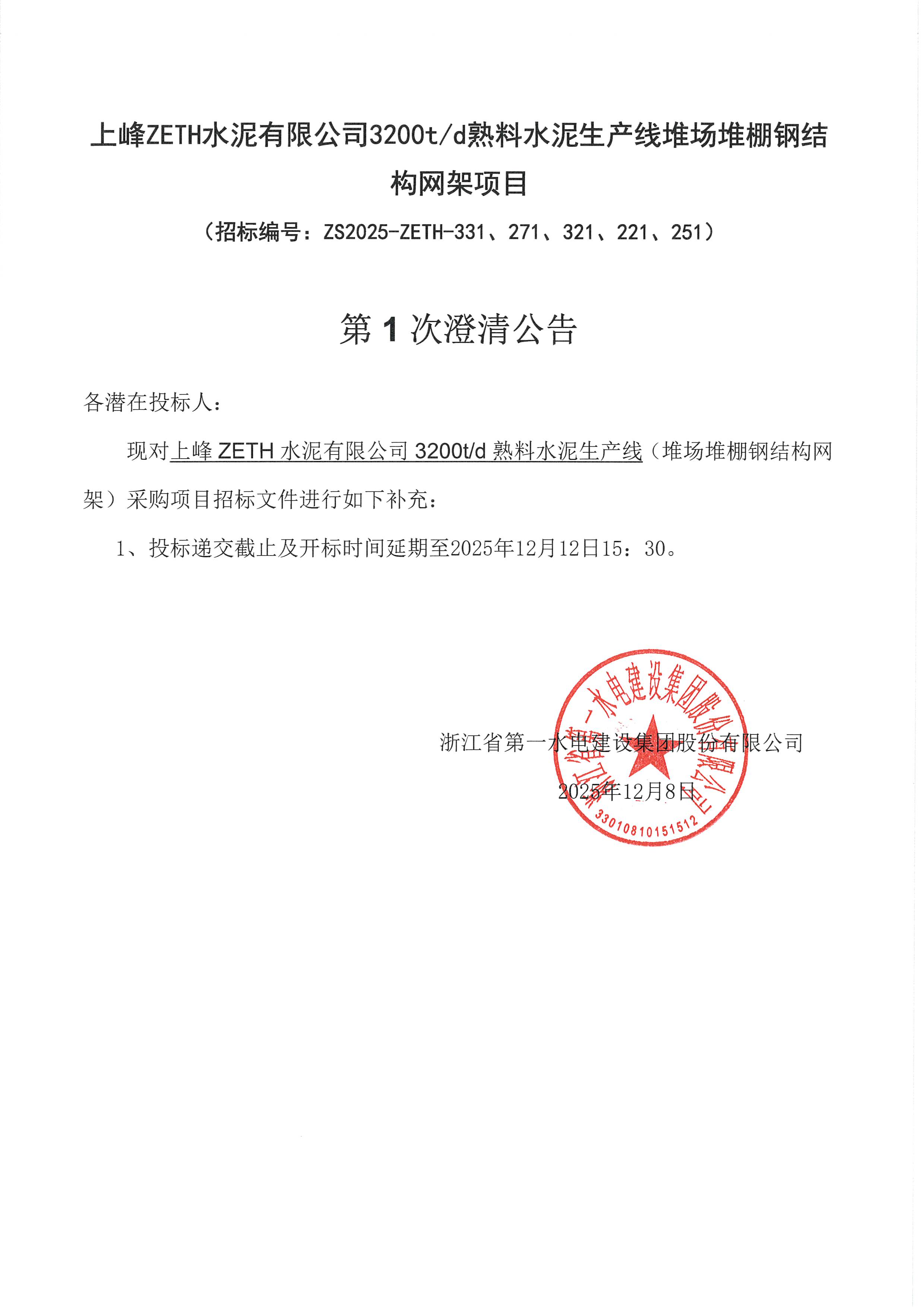 上峰ZETH水泥有限公司3200t/d熟料水泥生產(chǎn)線堆場堆棚鋼結(jié)構(gòu)網(wǎng)架項(xiàng)目第1次澄清公告